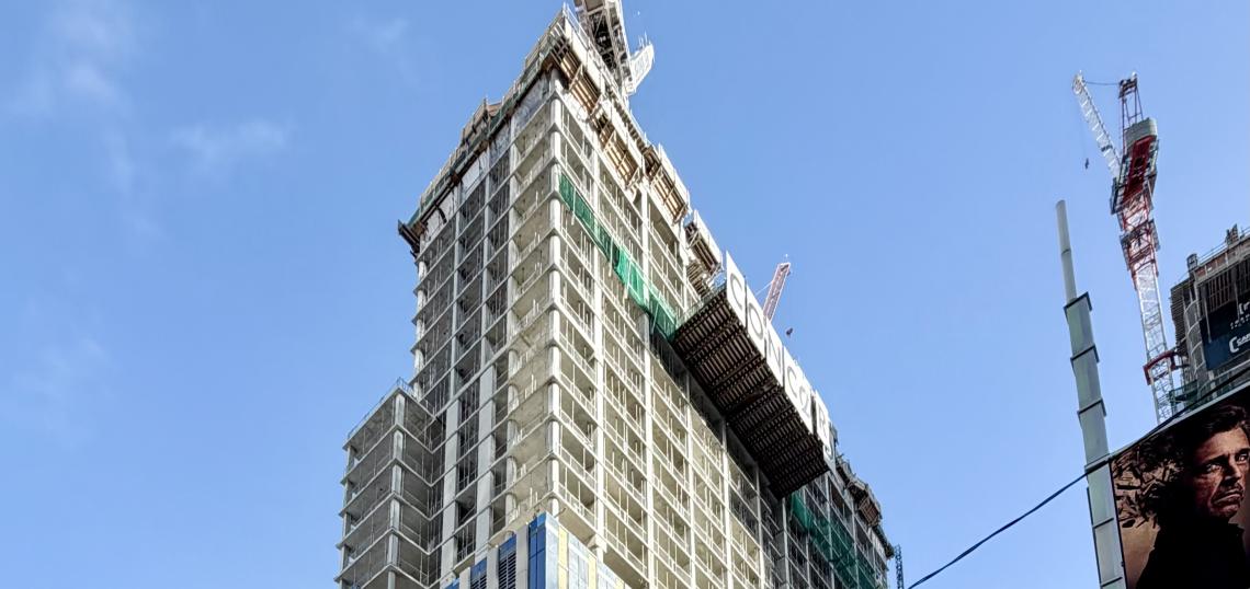 As of February 2026, construction approaches the 25-storey mark, with façade installation now advancing across the podium levels. With crews forming the towers residential levels, construction progress is expected to accelerate over the coming months.