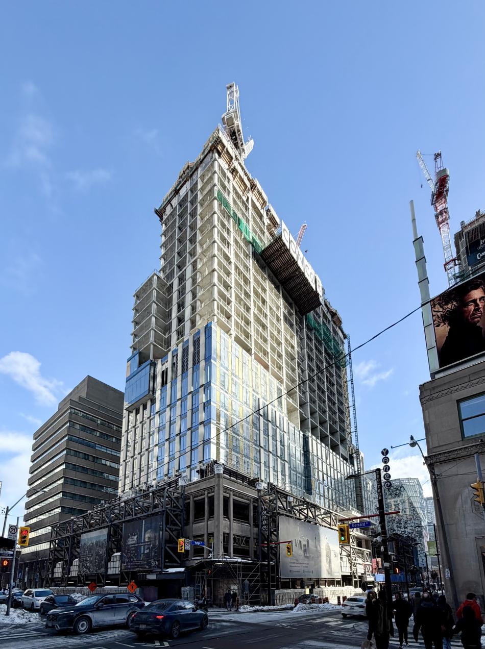 Construction advances at Concord Sky, Toronto’s next supertall skyscraper at Yonge and Gerrard, with the 85-storey mixed-use condominium tower steadily rising from the southeast corner of the intersection.